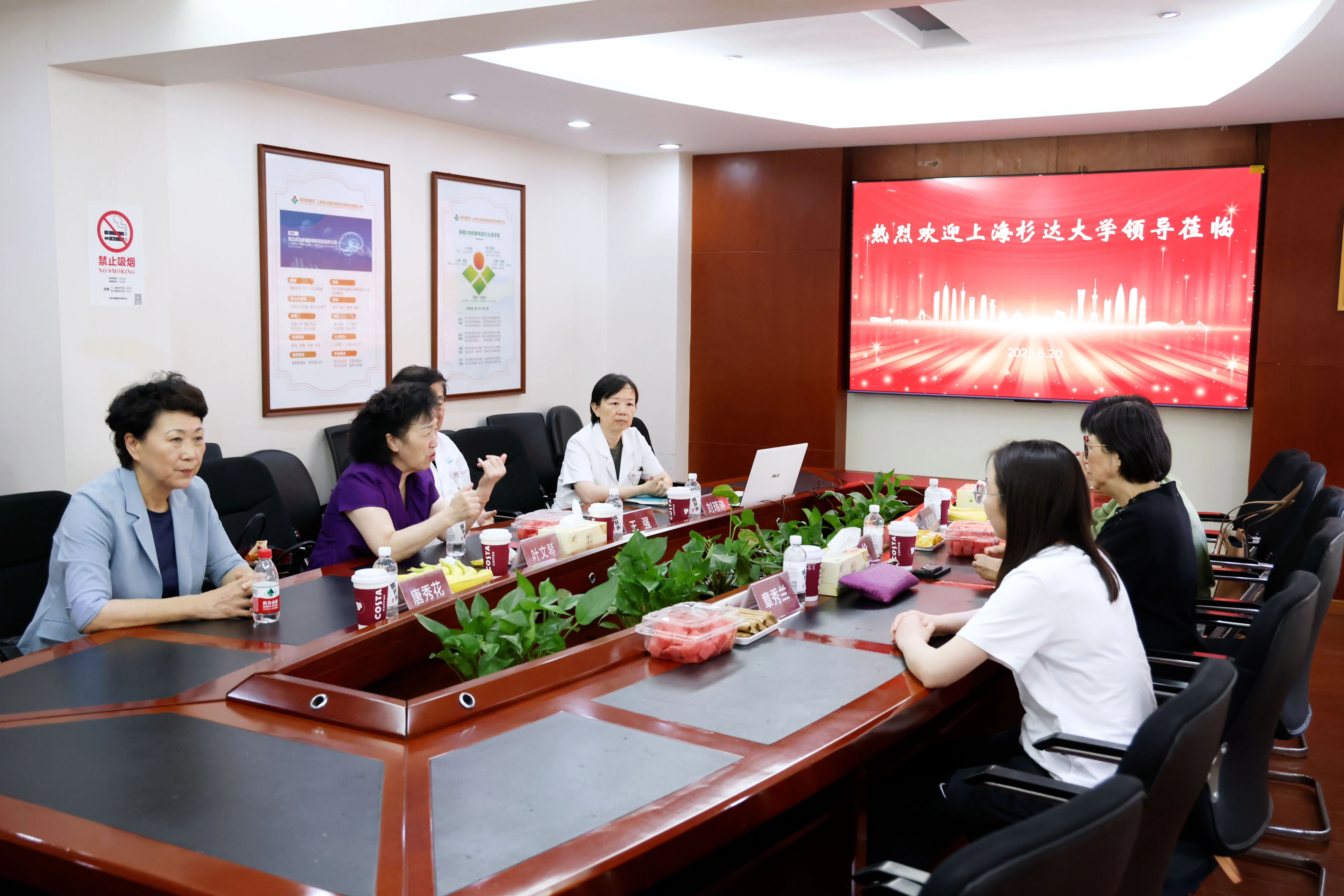 6 月 20 日下午,上海杉達(dá)學(xué)院國(guó)際醫(yī)學(xué)技術(shù)學(xué)院黨總支書(shū)記丁儉一行來(lái)到上海天佑醫(yī)院醫(yī)院,開(kāi)展“教學(xué)研”工作情況調(diào)研活動(dòng)。公司副總裁葉文琴、醫(yī)療管理部護(hù)理培訓(xùn)主任唐秀花,上海天佑醫(yī)院執(zhí)行院長(zhǎng)王強(qiáng),副院長(zhǎng)、護(hù)理部主任劉瑋琳陪同參觀并座談。