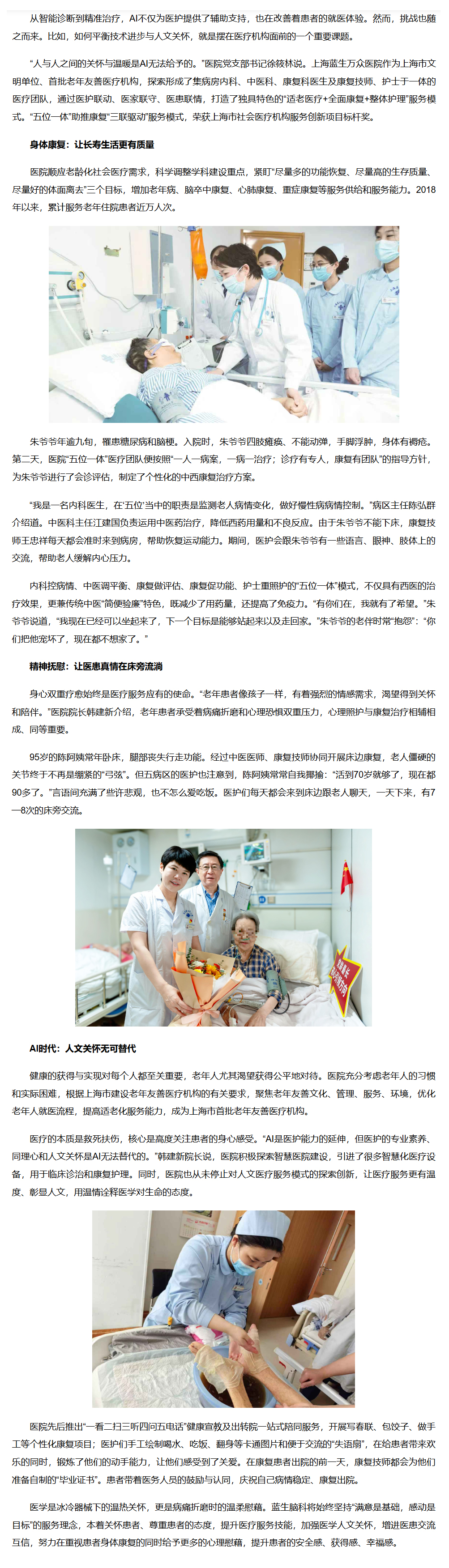 從智能診斷到精準(zhǔn)治療,AI不僅為醫(yī)護提供了輔助支持,也在改善著患者的就醫(yī)體驗。然而,挑戰(zhàn)也隨之而來。比如,如何平衡技術(shù)進步與人文關(guān)懷,就是擺在醫(yī)療機構(gòu)面前的一個重要課題。“人與人之間的關(guān)懷與溫暖是AI無法給予的。”醫(yī)院黨支部書記徐筱林說。上海藍生萬眾醫(yī)院作為上海市文明單位、首批老年友善醫(yī)療機構(gòu),探索形成了集病房內(nèi)科、中醫(yī)科、康復(fù)科醫(yī)生及康復(fù)技師、護士于一體的醫(yī)療團隊,通過醫(yī)護聯(lián)動、醫(yī)家聯(lián)守、醫(yī)患聯(lián)情,打造了獨具特色的“適老醫(yī)療+全面康復(fù)+整體護理”服務(wù)模式。“五位一體”助推康復(fù)“三聯(lián)驅(qū)動”服務(wù)模式,榮獲上海市社會醫(yī)療機構(gòu)服務(wù)創(chuàng)新項目標(biāo)桿獎。